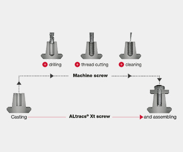 Due to the omission of different process steps, the use of thread forming fasteners provides great potential for economic savings. With ALtracs® Xt it is possible to assemble a screw joint directly into a cast geometry without further machining steps (e.g. drilling, thread cutting).  With its intelligent thread design ALtracs® Xt is able to cope with the tolerance of a casting process and provides a reliable process window even in harsh circumstances.